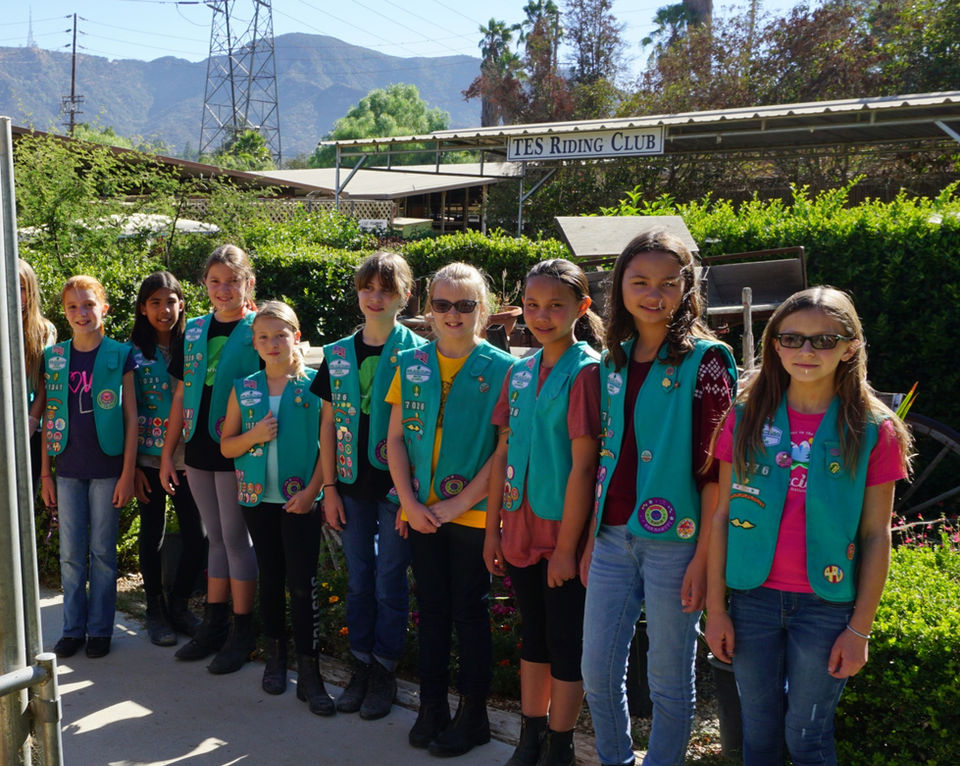 Scouts gather at the patio tables outside of the TES office. We will double check that parents have signed a release form for each scout, before fitting them with riding boots.